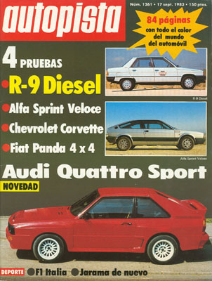 Banco de Pruebas del Renault 9 GTD. Prueba del Chevrolet Corvette. Presentación del Audi Quattro Sport. Banco de Pruebas del Alfa Romeo Sprint Veloce. Prueba del Fiat Panda 4x4. Massimo "Miki" Biasion. F3 en el Jarama. Gran Premio de Italia de Fórmula 1. 1.000 km de Spa.