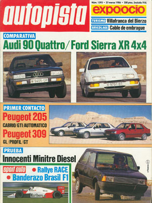 Comparativa entre el Audi 90 Quattro y el Ford Sierra XR 4x4, nuevos Peugeot 205 y 309, Expocio, Duesenberg SJ, prueba del Innocenti Minitre Diesel, rallye de RACE Costa Blanca, GP de F1 de Brasil, y muchos reportajes masa.