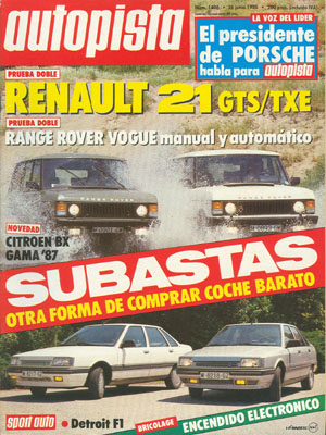 Prueba de los Renault 21 GTS y TXE nacionales. Citroen BX Serie II. Entrevista y reportaje de Porsche. Prueba de los Range Rover Vogue manual y Automatico.