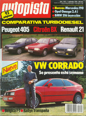 Presentación del Volkswagen Corrado. Prueba Comparativa: Citroën BX TRD/Peugeot 405 SRD/Renault 21 TD. Prueba Comparativa: GME Midi Diesel y Gasolina. Gran Premio de Bélgica de F1. Copa de España de Rallyes. III Rallye Transpaña.
