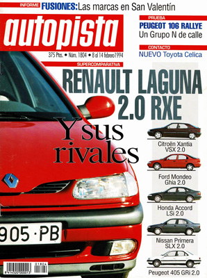 Presentación del nuevo Toyota Celica '94. Banco de Pruebas del Peugeot 106 Rallye. Banco de Pruebas del Renault Laguna 2.0. Prueba Comparativa: Renault Laguna 2.0 RXE/Citroën Xantia 2.0 VSX/Ford Mondeo 2.0 Ghia/Honda Accord 2.0 LSI/Nissan Primera 2.0 SLX/Peugeot 405 GRi. Los nuevos Clase 2 en España.