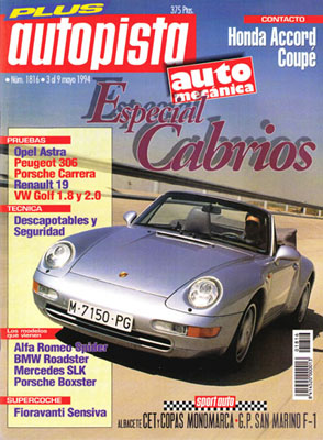 NUMERO ESPECIAL DEDICADO A LOS DESCAPOTABLES. Futuros Cabrios. Porsche Boxster. Prueba Comparativa: Opel Astra 2.0 Cabrio/Peugeot 306 2.0 Cabrio/Volkswagen Golf 2.0 Cabrio. Comparativa: Renault 19 1.8 Cabrio/Volkswagen Golf 1.8 Cabrio. Banco de Pruebas del Porsche 911 Carrera Cabrio Tiptronic. La seguridad en los descapotables. Bricolaje: Mecanismos del asiento. Fioravanti Sensiva. Slot años 30. Colección Granatelli. Ayrton Senna, historia de un campeón. Gran Premio de San Marino de F1.