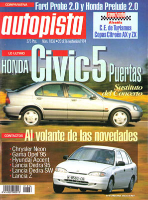 Contacto con el Hyundai Accent. Presentación del Honda Civic 5 puertas. Lancia Dedra Station Wagon. Chrysler Neon. Gama Opel '95. Prueba del Puegeot 106 1.5 Diesel. Prueba Comparativa: Ford Probe 2.0 16v/Honda Prelude 2.0 16v. Ferrari 333SP WSC.