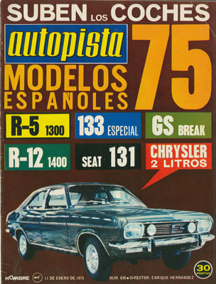Fotos espía del Chrysler 2 litros. Los modelos nacionales para 1975. Prueba del Fiat 128 Special 1300. Copa TS '74. Campeonato de Europa de Rallyes. La fase experimental de los modelos Mercedes. Consultorio.