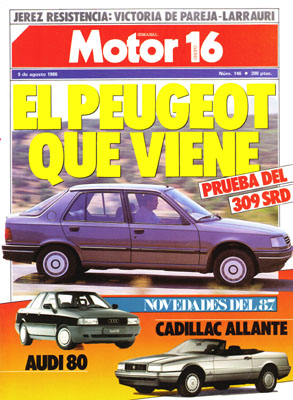 Al volante del Cadillac Allanté. Prueba del Peugeot 309 SRD. Prueba Comparativa: Audi 100 TD/Mercedes 250 D. Gran Premio de Inglaterra de F1. Rallye de Madeira. Sport Prototipos en Jerez.