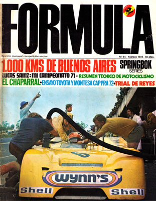AUTOMOVILISMO: 1.000 Km de Buenos Aires. Springbok Series. Chaparral. Proyectos Matra. Campeonato de coches antiguos. Prueba del Toyota Celica 1600 ST Coupé. Lucas Sainz relata su campeonato. Novedades Rallye 72. Biografía de Jean Pierre Wimille. Tecno F1. Campeonato de Campeonatos. MOTOCICLISMO: Resumen Técnico. Rallye Costa Brava. Toma de Contacto con la Cappra 72. Trial de Reyes. VARIOS: Calendario. Consultorio. Motonáutica. Miniaturas. Calendario. Teletype.