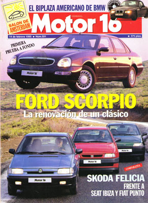 Prueba del Ford Scorpio 2.0i 16 Ghia. Prueba Comparativa: Skoda Felicia/Fiat Punto 75 SX/Seat Ibiza 1.4i CLX. Al volante del Jeep Cherokee 2.5 TD. Fotos espía del BMW Z3. Nuevo BMW 328i. Salón de Amsterdam. Ssangyong Musso. Hyundai HCD III Gila. Prueba Co