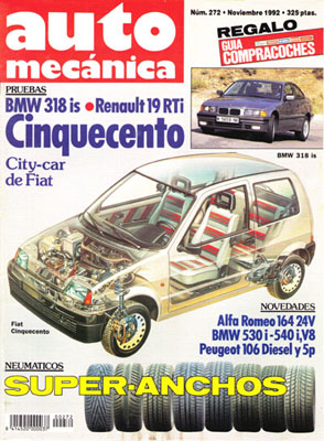 Novedades del Salón de París. Prueba del Fiat Cinquecento. Nuemáticos superanchos. Prueba del BMW 328is. Raid "Ciudades del ´92". Prueba del Renault 19 1.8 RTi. Las emisoras de radio se incorporan al automóvil. Visita a la fábrica de Ferrari en Maranello.