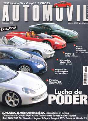 Exclusiva Prueba Comparativa: Aston Martin Vanquish/Bugatti EB 18.4 Veyron/Mercedes Vision SLR/Porsche Carrera GT/Volkswagen W12. Prueba del BMW 330Ci. Contacto: Mercedes C Sportcoupé, Citroën C5. Prueba Comparativa: Opel Astra Coupé Turbo/Toyota Celica T Sport. Prueba del Honda Civic Coupé 1.7 VTEC SE. Rallye de Montecarlo y de Suecia. Fórmula 1: los equipos en 2001. París-Dakar 2001.
