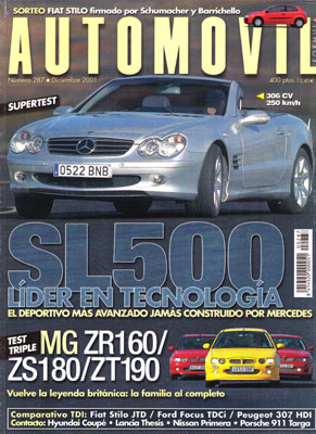 Prueba Comparativa: MG ZR160/ZS180/ZT190. Car of the year 2002. Prueba Comparativa: Peugeot 307 HDI/Fiat Stilo JTD/Ford Focus TDCi. Prueba del Mercedes SL500. Contactos: Porsche 911 Targa, Hyundai Coupé, Lancia Thesis, Nissan Primera. Tour de Córcega y Rallye de Autralia. Rallye de Cantabria. Clásicos: Tour de España.