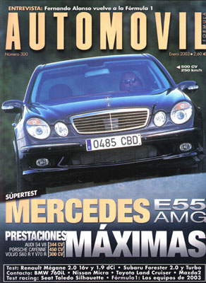 Prueba del Mercedes E55 AMG. Contactos: Audi S4, Volvo S60R/V70R, Porsche Cayenne, Toyota Land Cruiser, BMW 760Li 6.0 V12, Nissan Micra, Mazda 2. Prueba del Renault Mégane 2.0/1.9 dCi. Prueba del Subaru Forester 2.0 X. Prueba Racing del Seat Toledo Silouhette. Fórmula 1: pretemporada. Fernando Alonso. Dakar 2003. Clásico: Seat 1430 Londres-Méjico.