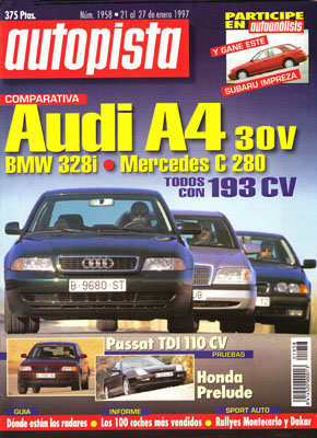 Prueba Comparativa: Audi A4 2.8/BMW 328i/Mercedes C280. Prueba del Audi A4 1.9 TDi. Prueba del Honda Prelude 2.2 VTEC. Guía de radares de nuestro país. Los 100 modelos más vendidos de 1996. Salón de Los Angeles. Nuevo Pontiac Rageous. Libros: Alfonso XIII y el automóvil. Rallye Dakar. Rallye de Montecarlo.