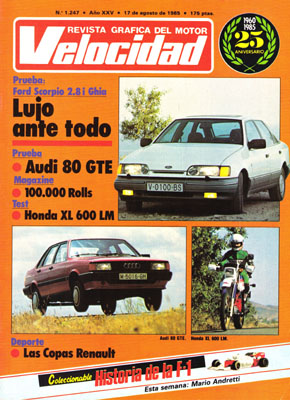 Prueba del Audi 80 GTE. Conducir por calles estrechas. Prueba del Ford Scorpio 2.8i Ghia. Historia de la Fórmula 1, los pilotos: Mario Andretti. Rolls-Royce, las 100.000 maravillas. Test de la Honda XL 600 LM. Copas Renault. Subida a Muncó. Consultorio técnico del lector.