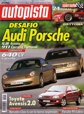 Prueba del Toyota Avensis 2.0. Prueba Comparativa: Audi S8 Tiptronic/Porsche 911 Carrera Tiptronic. Contacto con el Mercedes Clase A. Consultorio del lector. Prueba Comparativa: Citroën Berlingo 1.9 D Multiespace/Renault Kangoo 1.9 D RT. Reciclaje: objetivo, año 2015. 10 ideas para el fin de semana. Técnica: gasolina de competición. 24 Horas de Daytona. La Federación Española recompensa a los mejores. Entrevista a Luis Climent.