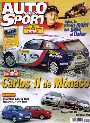 Prueba Comparativa: Volkswagen Polo GTi/Peugeot 206 GTi/Fiat Punto HGT. Prueba del Ford Mondeo TDdi TREND. Prueba Comparativa: Seat Arosa 1.4 16v Sport/Nissan Micra 1.4i 16v Sport. Prueba del Mitsubishi Montero iO 5 puertas. Escuela RACC Renault. Rallye de Montecarlo. París-Dakar. Fórmula 1: ensayos de pretemporada. Prueba del Hyundai Accent GT 16v 2001 de circuitos.