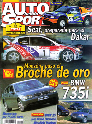 Prueba del BMW 735i. Prueba del Mitsubishi Colt 1.3 16v GLS. Prueba Comparativa: Jeep Grand Cherokee CRD Limited/BMW X5 3.0d/Mitsubishi Montero DI-D GLS Kaiteki. Al volante del Toyota Yaris D-4D y el Renault Laguna IDE. Salón de Valencia. MotorShow de Bilbao. Fórmula 1: Análisis de los preparativos para 2002. Seat gana la apelación contra Jesús Puras. Última prueba del Nacional. Equipo Seat para el Dakar. Entrega de premios del Europeo de Montaña.