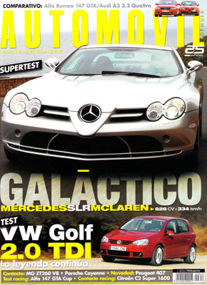 Prueba Comparativa: Alfa Romeo 147 GTA/Audi A3 3.2 Quattro. Prueba del Mercedes SLR McLaren. Contacto con el MG ZT260 V8. Contacto con el Porsche Cayenne. Prueba del Volkswagen Golf TDi 2.0. Nuevo Peugeot 407. Prueba Racing del Alfa Romeo 147 GTA Cup. Contacto Racing con el Citroën C2 S1600. Dakar 2004. Clásicos: Mercedes Sport Wagon.