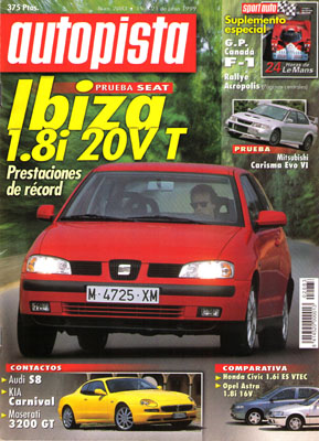 Contacto: Seat Ibiza y Córdoba 99, Maserati 3200 GT, Kia Carnival, Audi S8. Prueba del Seat Ibiza 1.8i 20VT Sport. Entrevista a José Ignacio López de Arriortúa. G.P. de Canadá de F1. 24 Horas de Le Mans. Rallye Acrópolis. Campeonato de España de rallyes de tierra. Prueba Comparativa: Honda Civic 5p 1.6i ES VTEC/Opel Astra 5p Elegance. Prueba del Mitsubishi Carisma Evo VI RS.