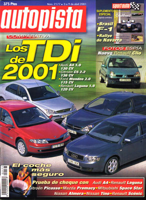 Prueba Comparativa: Audi A4 1.9 TDi/Citroën C5 2.2 16v HDi Exclusive/Ford Mondeo TDdi Trend/Renault Laguna 1.9 dCi Privilege. Actualidad: Retrato del autmovilista español. Prueba del Seat Toledo 2.3 V5 20v Sport. Fotos espía del nuevo Renault Clio. G.P. de Brasil de F1. Entrevista a Oriol Servia, piloto de la Fórmula CART. Rallye de Navarra. Exposición Pegaso Z-102 en el CCCB. Técnica: Motor Audi 6.0 W12. Crash-test monovolúmenes. Contacto: nuevo Mercedes Clase A, Mercedes C32 AMG, Hyundai Santa Fe CRDi.