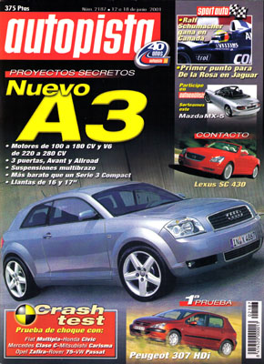 Contacto: Lexus SC 430, Rover 75 Tourer. Prueba del Peugeot 307 HDI XT. Anticipación: Nuevo Audi A3. Crash-test de 7 coches de gama media. Prueba Comparativa: Opel Omega 3.2 V6/Peugeot 607 3.0 V6 Pack. Prueba del Nissan Almera 2.2 Di 16v. Salón Motortec 2001. Técnica: ligereza extrema. 24 Horas de Le Mans, la gran guerra. G.P. de Canadá de F1. Rallye Villa de Llanes.