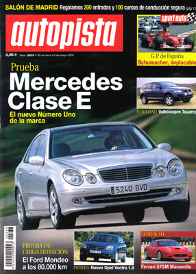 Prueba del Opel Vectra 1.8 16v Comfort. Nuevo VW Touareg. Contacto: Mercedes CLK, Ferrari 575M Maranello. Prueba del Mercedes E500. Prueba Comparativa: Honda CR-V 2.0i ES/Nissan X-Trail 2.0i Elegance. Magazine: coches a medida. Prueba de larga duración: Ford Mondeo TDdi. Tour Auto Histórico. Anticipación: nuevo Maserati Quattroporte. Prueba Racing: Seat León Cupra R. G.P. de España de F1.