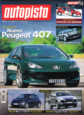 Contacto con el Smart roadster y Coupé. Prueba del Porsche Cayenne Turbo. Prueba del Nissan Micra 1.2 80CV Tekna. Nuevo Mercedes CLK Cabrio y Porsche Carrera GT. Nuevo Peugeot 407. Salón de Amsterdam. Salón Retromovil 2003. Presentación del equipo Ferrari 2003. Rallye de Suecia. 24 Horas de Daytona.
