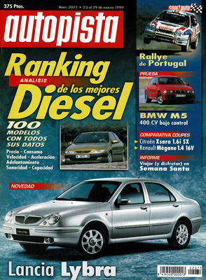 Prueba del BMW M5. Dossier: los mejores Diesel. Prueba Comparativa: Citroën Xsara 1.6 SX Coupé/Renault Mégane 1.4 16v Coupé. Informe: viajar en Semana Santa. Nuevo Lancia Lybra. Contacto con el Subaru Legacy. Campeonato de España de Rallyes. Racing&Festival 1999. 12 Horas del Jarama. Prueba del Renault Clio Eurocap. Rallye de Portugal.