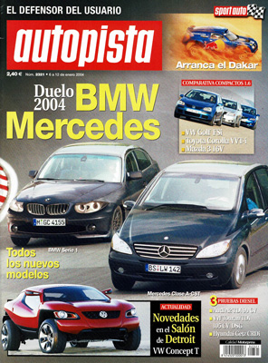 Salón de Detroit. BMW contra Mercedes, el duelo del año. Prueba Comparativa: Mazda 3 1.6i 16v Active+/Toyota Corolla 1.6 VVT-i Sol/Volkswagen Golf 1.6 FSI Highline. Prueba del Audi A2 1.4 90CV. Prueba del Hyundai Getz 1.5 CRDi. Volkswagen Touran 1.9 TDI DSG. Hidrógeno en la ciudad. Trofeo Andros de carreras de hielo. Arranca el París-Dakar 2004.