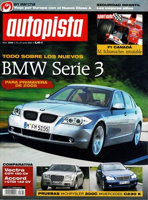 Prueba Comparativa: Honda Accord 2.2i-CTDI/Opel Vectra 1.9 CDTI. Nuevos BMW Serie 3. Ecología: Hidrógeno, energía con vistas. Contacto con el Fiat Multipla. Crash-test: Smart frente a Mercedes Clase E. Prueba del Chrysler 300C. Prueba del Mercedes C230 K. Salón de Pekín. 24 Horas de Le Mans. G.P. de Canadá de F1. Rallye de Zamora.