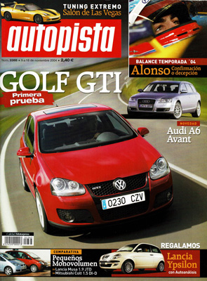 Prueba del Volkswagen Golf GTi. Reportaje: cuadro de generaciones del Golf GTi. Nuevo Audi A6 Avant. Prueba Comparativa: Renault Laguna 2.0T/Saab 9-3 Sport Sedán 2.0T Vector. Prueba Comparativa: Lancia Musa 1.9 JTD/Mitsubishi Colt 1.5 DI-D. Gas natural, alternativa al Diesel. Salón de Las Vegas 2004. Alonso, hora del balance. Planes Ford 2005. Rallye Costa del Sol.