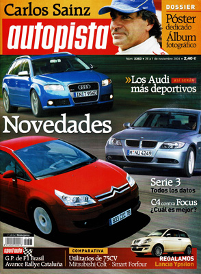 Prueba del Jaguar S-Type 4.2 R. Contactos: Alfa Romeo 147, Citroën C4, Porsche Boxster. Nuevos Audi S y RS. Prueba Comparativa: Mitsubishi Colt 1.1/Smart Forfour 1.1. Tour de Classic España. El adiós de Carlos Sainz. Avance Rallye de Cataluña. G.P. de Brasil de F1. Rallye de Orense.