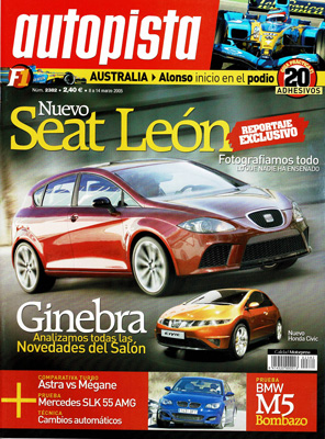 Prueba del Mercedes SLK 55 AMG. Prueba del BMW M5. Salón de Ginebra. Automecánica: el M5 bajo la lupa. Los cambios automáticos. Prueba Comparativa: Opel Astra 2.0 Turbo/Renault Mégane 2.0T. Seat León Prototipo. G.P. de Australia de F1. Cuenta atrás para el Campeonato de España de Rallyes. Prueba Racing: Citroën C2 Super 1600.