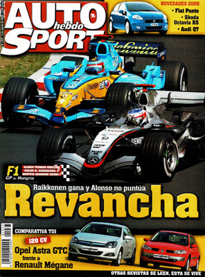 Prueba Comparativa: Opel Astra GTC CDTi/Renault Mégane 1.9 dCi. Prueba del BMW 740i. Novedades: Fiat Punto 2006, Skoda Octavia RS y Audi Q7. Al volante: Mazda 6 2006 y Volkswagen Passat Variant 2.0 FSI 150 CV. G.P. de Hungría de F1. Avance del Rallye de Finlandia. Prueba racing del Mitsubishi Pajero Evolution.