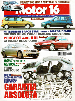 Prueba del Audi A6 2.8 Quattro. Prueba Comparativa: Mazda Demio 1.3 FE/Mitsubishi Space Star 1.3 GLX Plus. Novedades: Grama Fiat Bravo y Brava 99, Peugeot 406 HDi, nuevo Audi A8, Galloper Santamo, BMW Serie 3 Coupé. 30.000 kms. con un Honda Civic 1.5i VTEC-2 LS 5p. Al volante: Gama Renault Automáticos, Nissan Altra. Carlos Sainz prueba el Toyota de Le Mans. Peugeot 206 WRC. Marc Gené hace un repaso de la temporada.