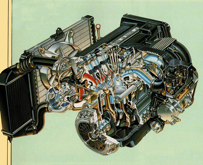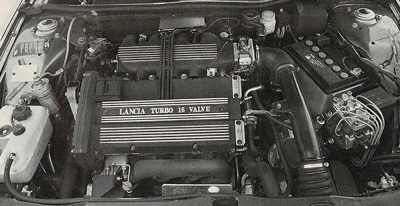 El motor que propulsa a este modelo es su rasgo más determinante. La meta perseguida por los hombres de Lancia, un alto nivel de potencia, se ha resuelto con la adopción, en conjunto, de los dos sistemas más en boga en la actualidad: cuatro válvulas por cilindro y sobrealimentación por turbo-compresor. Los 1.995 cm3 que cubica se consiguen mediante una carrera de 90 mm. y un diámetro de 84, esto es, un motor teóricamente proclive a una buena respuesta a pocas revoluciones. La relación de compresión es relativamente baja, como suele ser normal en motores sobrealimentados, obteniendo una potencia de 185 CV. a un tranquilo régimen de 5.500 r.p.m., momento en el que la velocidad media del pistón no supera los 16.5 m/s.