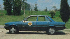 a 2.000 r.p.m. TRANSMISION Embrague: Tipo: Monodisco en seco, de diafragma. Diámetro del disco: 215 mm. Mando: Por cable. Cambio de marchas. N.º de marchas de avance: Cuatro. Sincronizadas: Todas. Relaciones internas: 1.ª 3,704:1; 2.ª 2,170:1; 3.ª 1,409:1; 4.ª 1:1 . Grupo y diferencial. Disposición motriz: Motor, embrague y cambio delante, unidos rígidamente por un tubo hueco, que aloja al árbol de transmisión, con el diferencial suspendido, situado atrás. Tipo del grupo: Cónico hipoide. Reducción: 3,700:1 (10/37). Desarrollo final de la transmisión: 31,3 km/h. a 1.000 r.p.m. en 4.ª. BASTIDOR Estructura portante: Carrocería monocasco autoportante. Suspensiones: Delantera: Ruedas independientes, tipo Mac Pherson. Tipo de resorte: Muelles helicoidales. Amortiguador: Hidráulicos talescópicos. Estabilizador: Barra de torsión antibalanceo. Trasera: Ruedas independientes, tiradas por brazos con eje de oscilación ligeramente oblicuo. Tipo de resorte: Muelles helicoidales. Amortiguador: Hidráulicos telescópicos. Estabilizador: Barra de torsión antibalanceo. Frenos: Tipo de circuito: Independiente para cada tren, con luces de nivel y desgaste. Asistencia: Master-Vac de 8". Dispositivo antiblocaje: Compensador trasero en función de la carga. Tipo delanteros: Discos. Diámetro: 273 mm. Area barrida: 1.395 cm2. Tipo traseros: Tambores. Diámetro: 265 mm. Area barrida: 721 cm2. Area barrida por los forros de los cuatro frenos, en total: 2.116 cm2. Dirección: Tipo: De cremallera. Desmultiplicación: 17:1. Diámetro de giro: 10,7 m. Vueltas volante, de tope a tope: 3,1 Arbol de dirección: Articulado. Servo: Hidráulico. Diámetro externo del volante: 39 cm. Ruedas: Diámetro llanta: 14 pulgadas. Anchura garganta llanta: 5 pulgadas. Neumáticos: Radiales, sin cámara. Medida: 175 SR-14. Marca: Michelin XZX. Equipo eléctrico de 12 voltios: Generador: Alternador, de 500 vatios y 36 amperios. Regulador: Incorporado. Batería: Atsa, de 60 Amperios/hora. Motor de arranque: Bosch. Depósito de combustible: Situación: Posterior izquierda, bajo el maletero. Capacidad: 56 litros. CARROCERIA Tipo: Berlina. N.º puertas: 4. Asientos: Delante, dos butacas; detrás, corrido, con descansabrazos central. Dimensiones: Batalla: 2,74 m. Vías: 1,46/1,43 m. (delante/detrás). Longitud: 4,58 m. Anchura: 1,72 m. Altura: 1,45 m. Peso: En vacío, y en orden de marcha (según catálogo): 1.310 kg. Con depósito lleno (en báscula): 1.288 kg. Reparto de peso entre ambos trenes (delante/detrás): 54,3/ 45,7 % (depósito lleno). Equipo: Faros: SEV-Marchal halógenos, de 340 x 160 mm., con lámpara H-4, de 60/55 vatios. Limpiaparabrisas: SEV-Marchal. Escobillas: SEV-Marchal. Velocidades: Aislada manual, intermitente y dos continuas. Frecuencia: 48 y 71 ciclos/minuto, y cada 6 segundos. Instrumentación: Veglia. Bocina: Dos Seima. · Autor: Arturo Andrés (AUTOPISTA nº 1103, 31de Mayo 1980)
