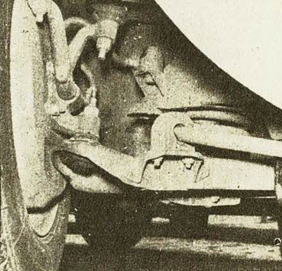 Por otra parte, si el mayor peso atrás pudiera producir derrape incontrolable, todo ello se ha evitado con la debida caída negativa de las ruedas sobre el pavimento y por el propio tipo de ruedas adoptado. Además de las barras estabilizadoras delante y atrás, se cuenta con dos amortiguadores telescópicos en cada una de las ruedas traseras, que evitan oscilaciones de la caja alternativamente hacia arriba y hacia abajo, que pudieran ser molestas e incluso peligrosas. Contribuyen a lo mismo los topes de caucho que limitan el recorrido de bajada de la carrocería en los movimientos de suspensión y las cintas que en forma de abrazadera limitan el recorrido de subida de la carrocería en tales movimientos, cuya amplitud podría ser aumentada por la inercia del peso del motor, haciendo palanca por detrás del eje posterior. Se trata, en suma, de un coche muy estable dentro de su condición de “todo atrás", en el que lo bajo de su construcción y colocación del centro de gravedad, son principales premisas para conseguirlo, junto a las particularidades antes enunciadas.