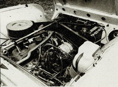 El motor va dispuesto longitudinalmente, con la caja de cambios por delante del mismo para evitar la colocación de éste en voladizo, lo que podría conferirle algún carácter subvirador, esto es, tendencia a seguir por derecho en las curvas pequeñas y medias tomadas a velocidad considerable. Son cuatro cilindros en línea con cinco apoyos de cigüeñal, lo que evita vibraciones y alarga la vida del motor. La cubicación es de 1.108 c. c. y con su relación de compresión de 8,3 a 1 da una potencia de 38 CV. a 4.500 r. p. m. Respecto al mejor par motor, aunque no es muy alto, con sus 7,3 kilográmetros, lo da a 2.000 r. p. m., confiriendo una gran elasticidad en los regímenes bajos, lo que se nota al poder marchar muy despacio en tercera y aun en cuarta, sin tirones ostensibles y a pesar de que las marchas no son de corto desarrollo (desde luego, no son tampoco excesivamente largas).