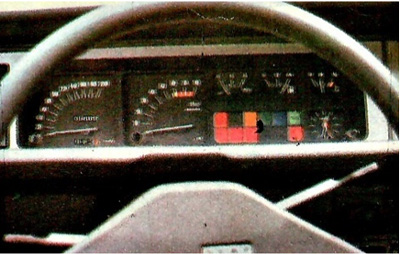 El 132 ya trae de serie los intermitentes de emergencia y, sobre todo una muy práctica disposición de quitasoles a base de láminas plásticas casi opacas, escamoteables en el techo por delante y los lados, de cuyo eficaz funcionamiento podemos dar fe, gracias a las dos horas de adelanto sobre el sol, por lo que todavía hay luz solar bien pasadas las diez de la tarde. En cuanto a la nueva instrumentación, no nos convence. De acuerdo en que el aspecto del cuadro resulta mu- cho más moderno que el antiguo; pero los dos instrumentos principales (velocímetro y tacómetro): con el sector graduado sobre un arco de 120 grados, resultan mucho menos perceptibles que los antiguos, en los que la aguja recorría un arco algo más del doble para una misma variación. La claridad de un instrumento no reside únicamente en la distancia entre cada marca, sino también en la diferencia angular entre las dos posiciones de la aguja. Antes, para un conductor ya acostumbrado a su coche, Ia diferencia entre 4000 y 6000 rpm, se notaba de una ojeada, nada más que por la postura de la aguja (casi 70 grados de diferencia). Ahora también se puede percibir, pero hay que recurrir a mirar con atención los números, pues la variación angular de la aguja es simplemente de 30 grados.